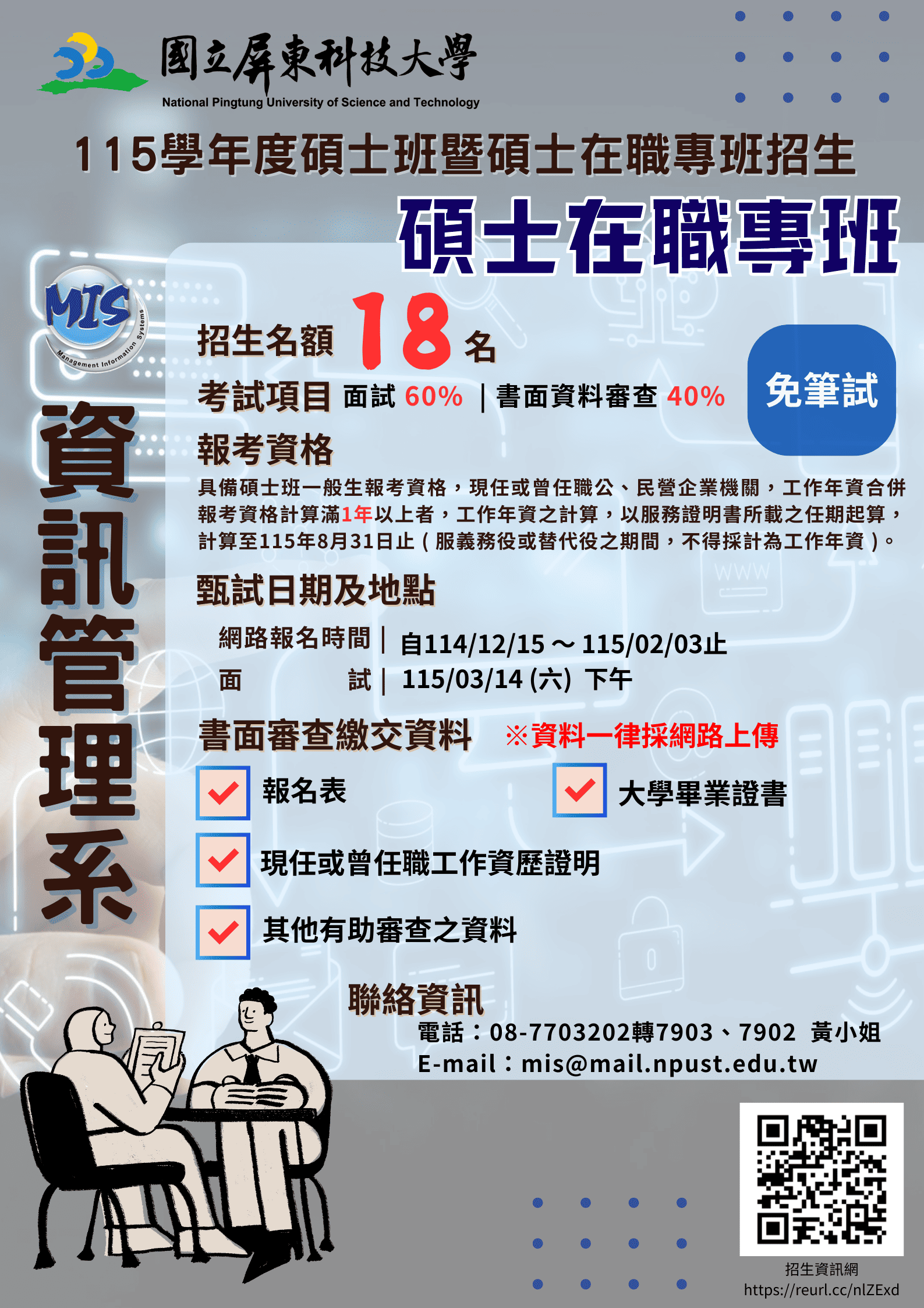 【資訊管理系】國立屏東科技大學114學年度碩士班甄試~熱烈招生中~歡迎報考!