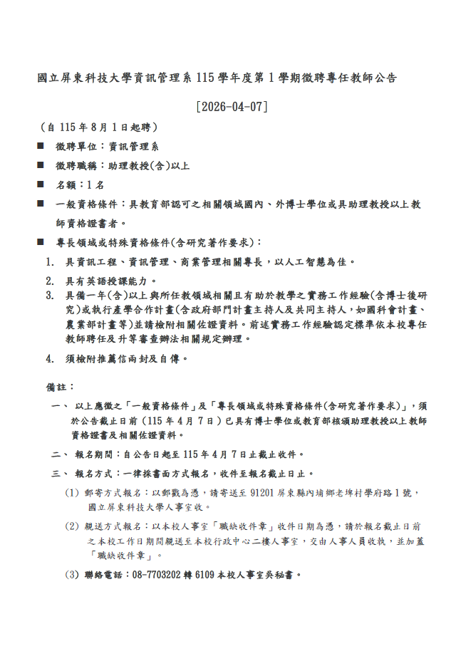 國立屏東科技大學資訊管理系115學年度第1學期徵聘專任教師公告_1150324